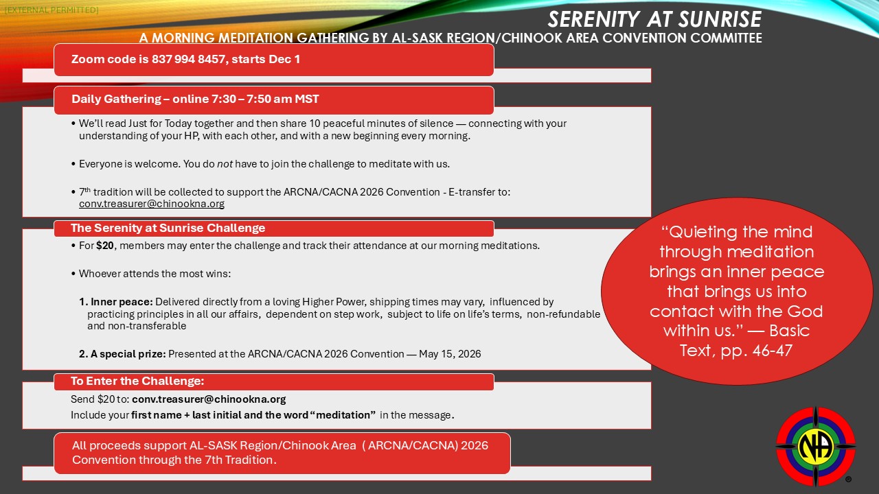 Zoom code is 837 994 8457 Virtual, Virtual, Alberta, CanadaThe AL-SASK/Chinook Area Convention Committee are hosting a daily meditation as a fundraiser for our event. Every day at 7:30 am from Dec 1st until the convention on May 15th […]